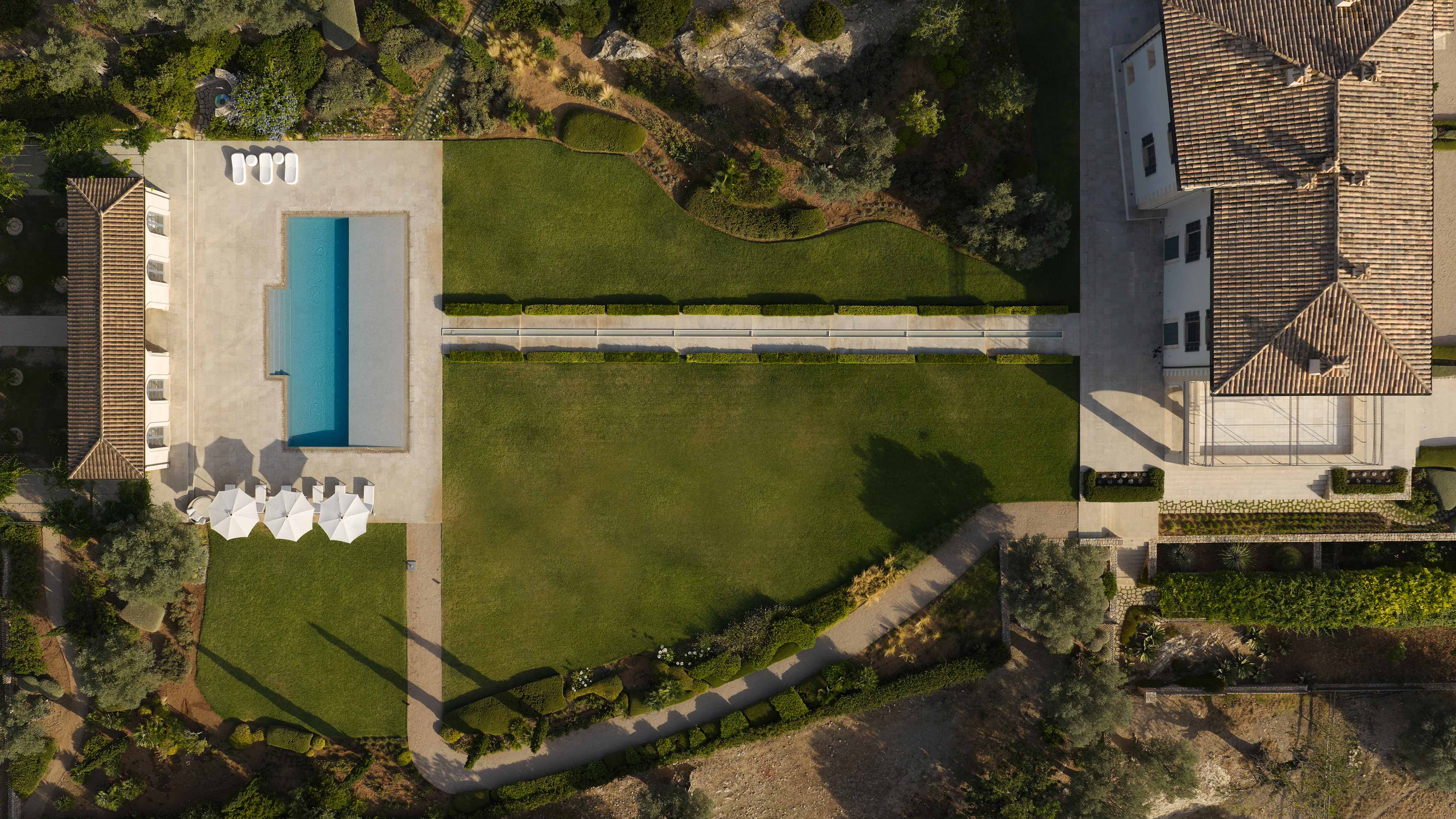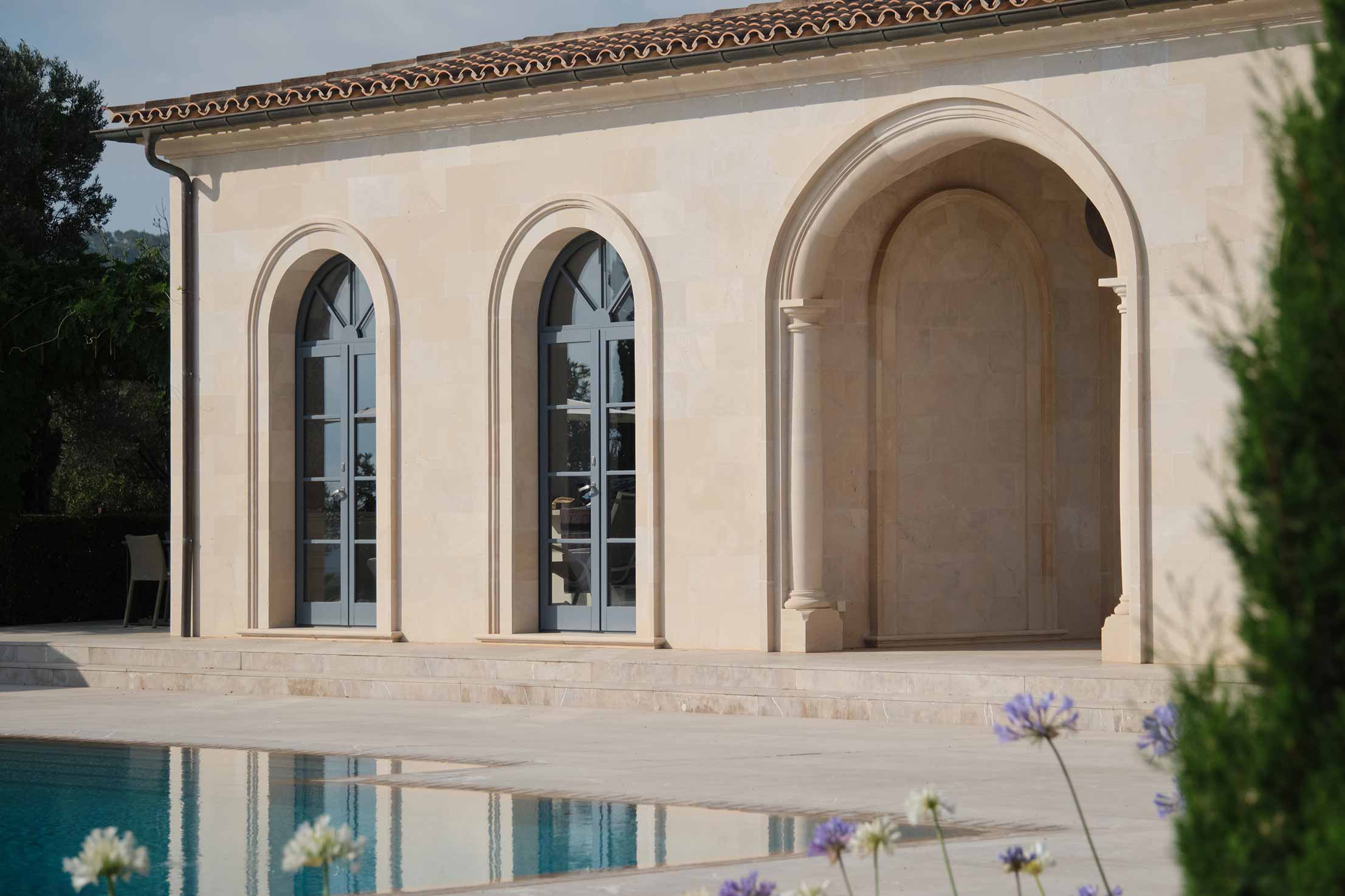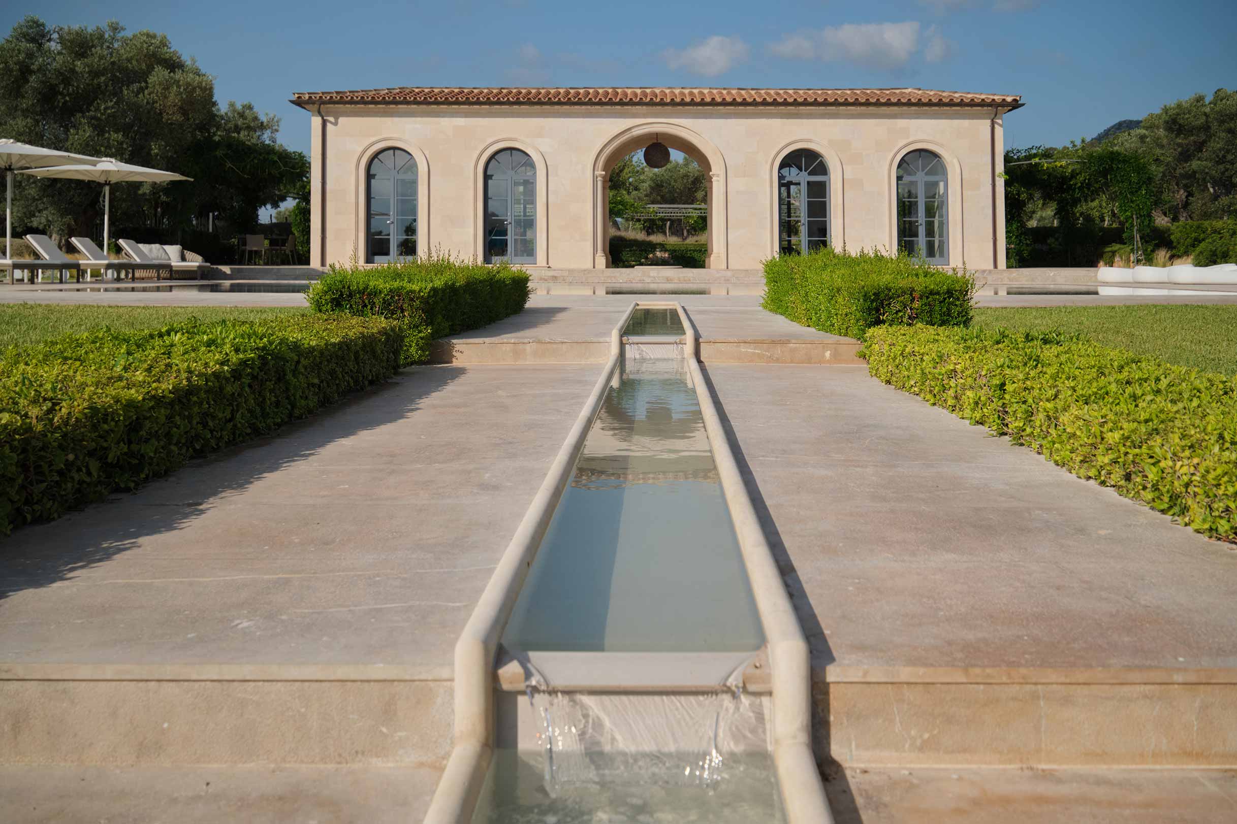 Outdoors, dry-stone walls, Mediterranean planting geometry, and a reflective water feature frame the main access. The result is a property that proves how to build with technical excellence, respect for tradition, and a contemporary vision designed to endure.