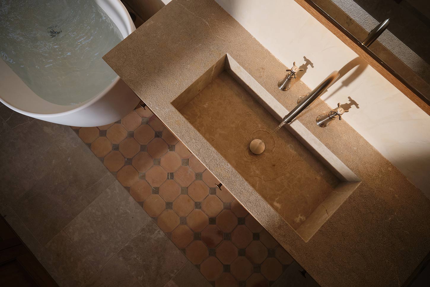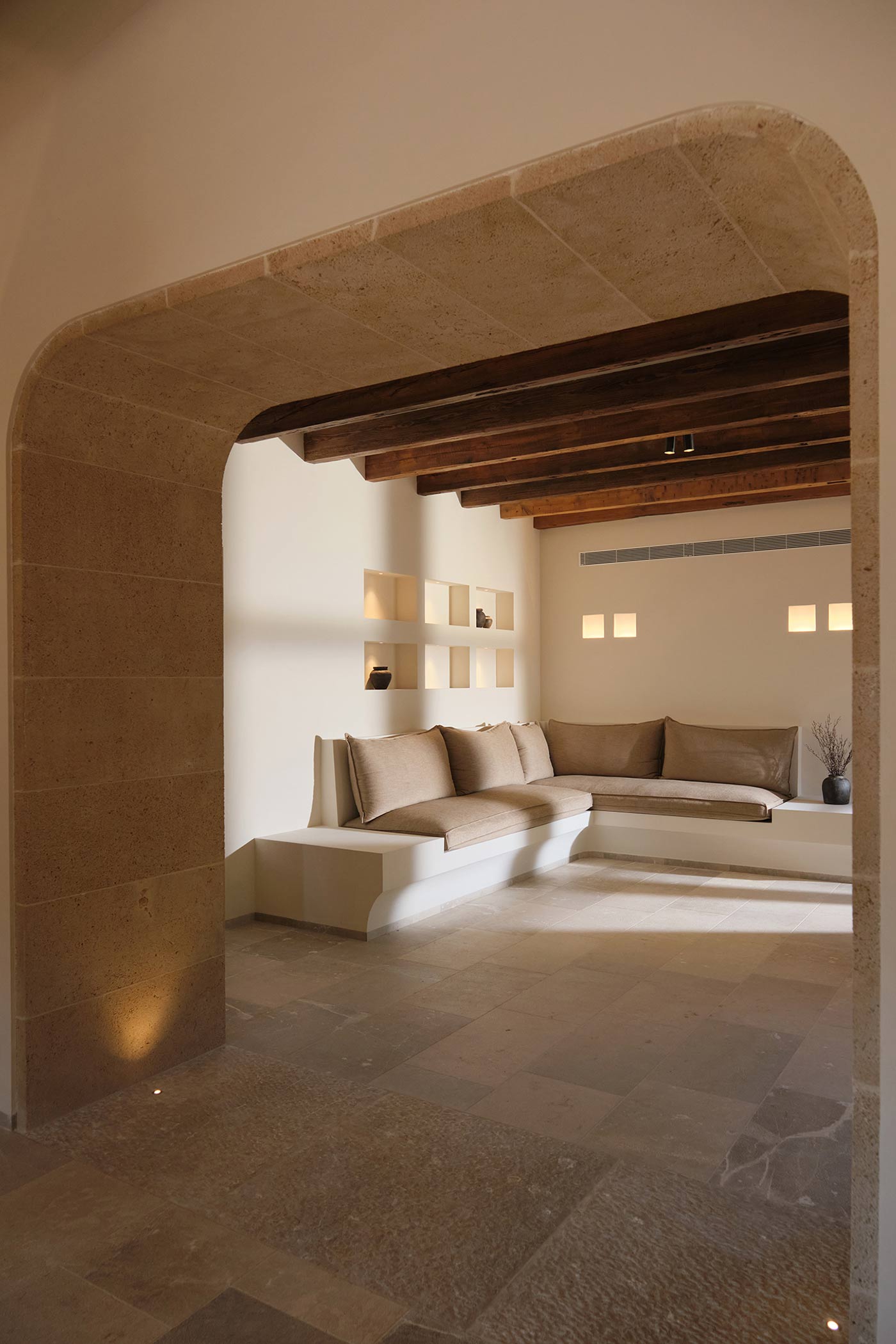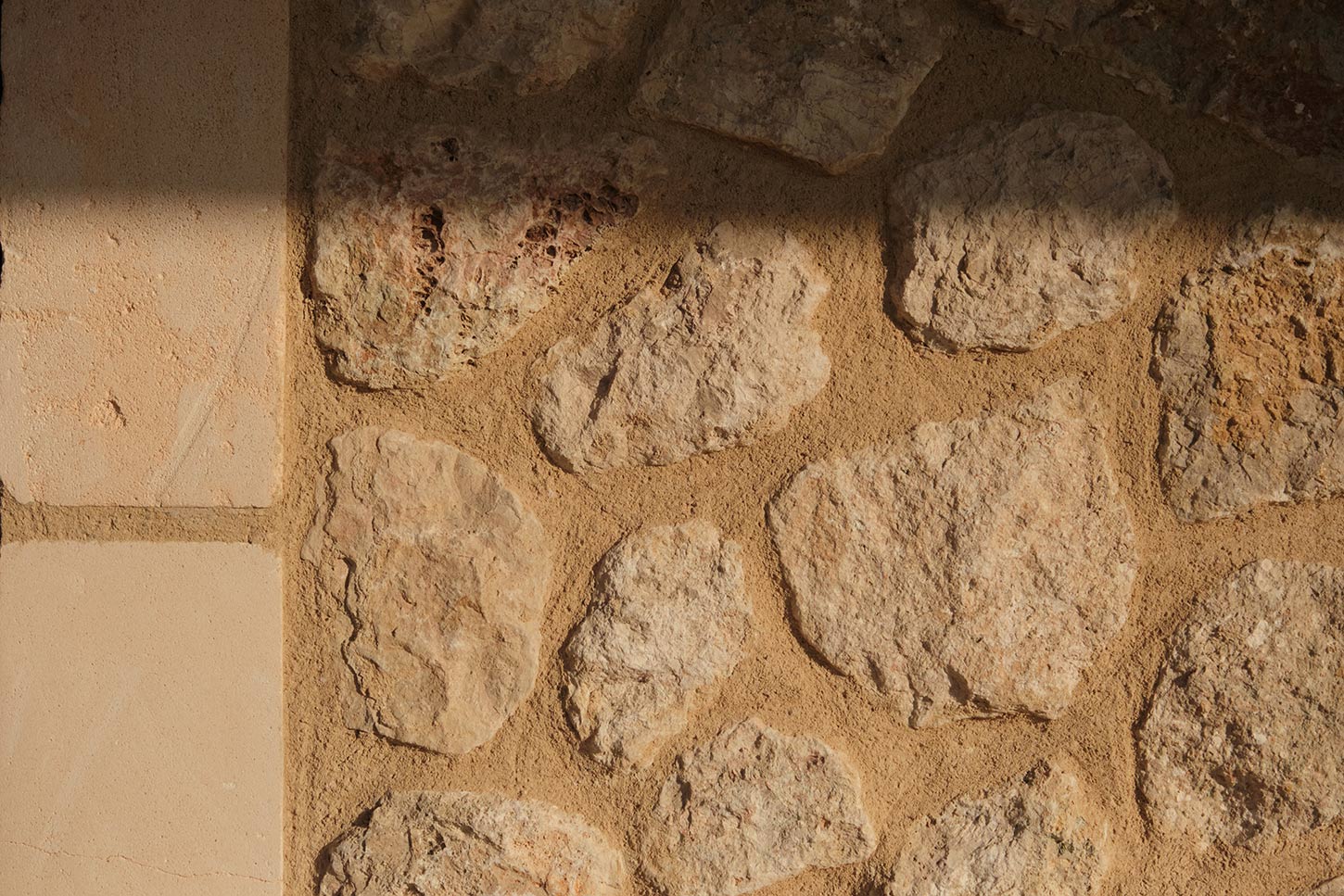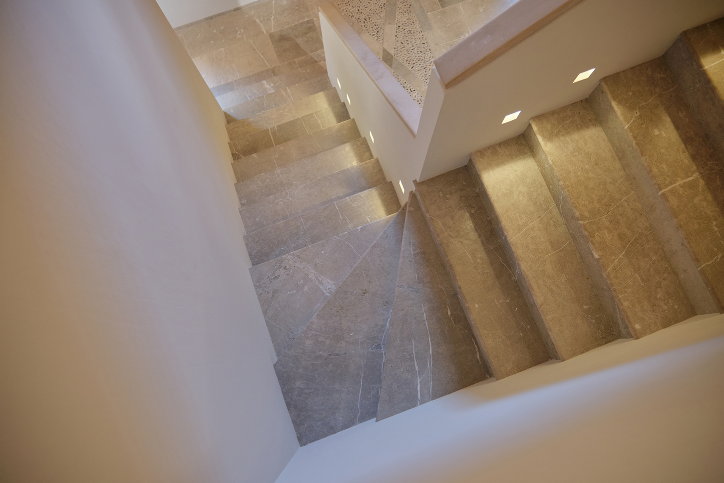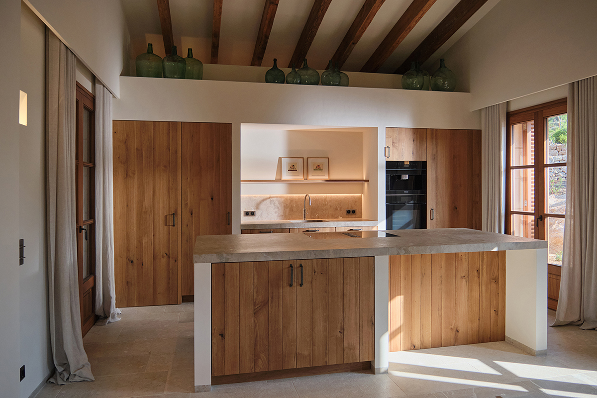 Its materials speak of memory and place: Mallorcan stone beneath the feet, iroko and brushed oak in the carpentry, resistant plasters that protect and beautify, and details in mares recalling the island’s heritage. The stone extracted from the site itself shapes the façade, binding the home deeply to the land that sustains it.