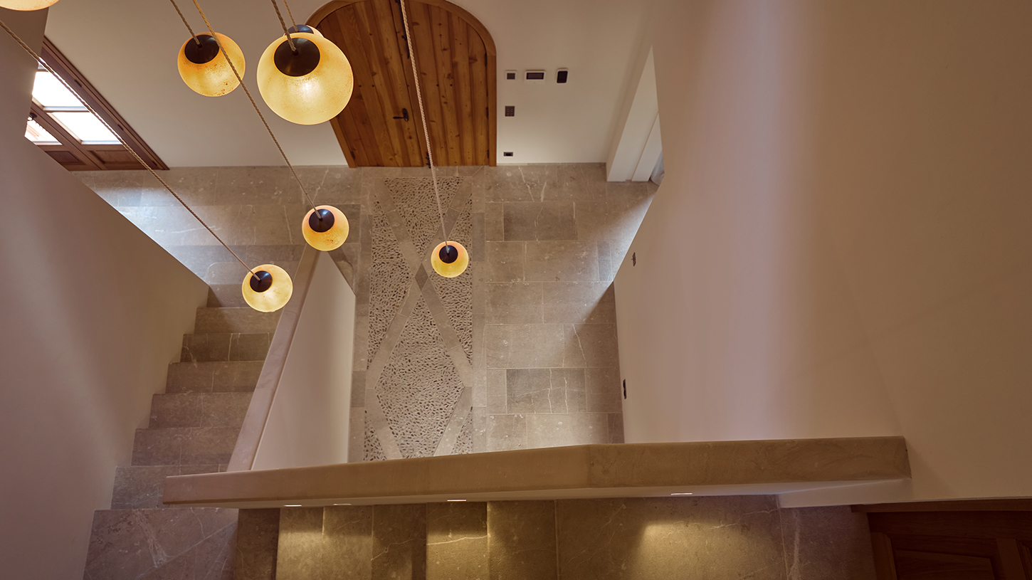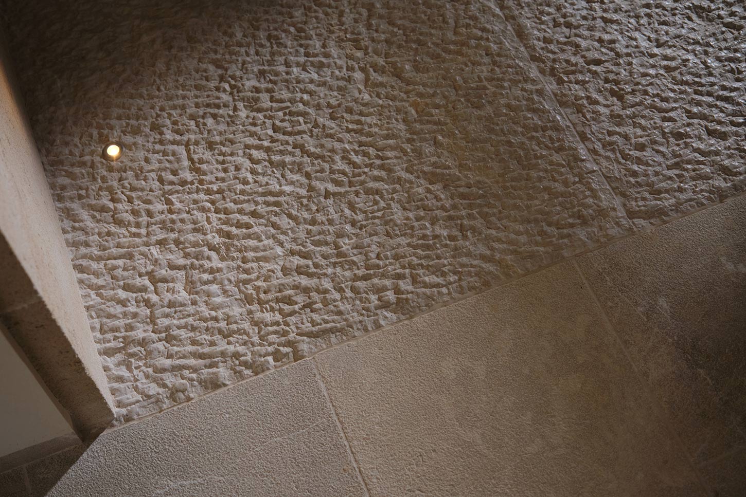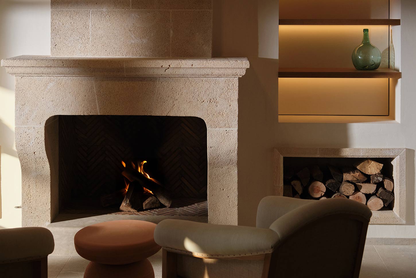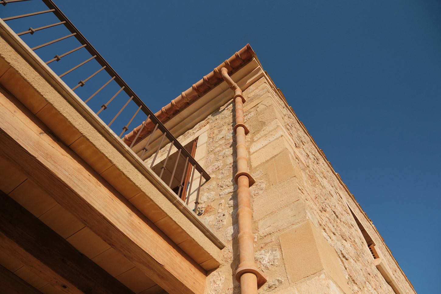 Its materials speak of memory and place: Mallorcan stone beneath the feet, iroko and brushed oak in the carpentry, resistant plasters that protect and beautify, and details in mares recalling the island’s heritage. The stone extracted from the site itself shapes the façade, binding the home deeply to the land that sustains it.