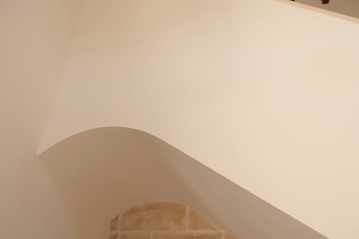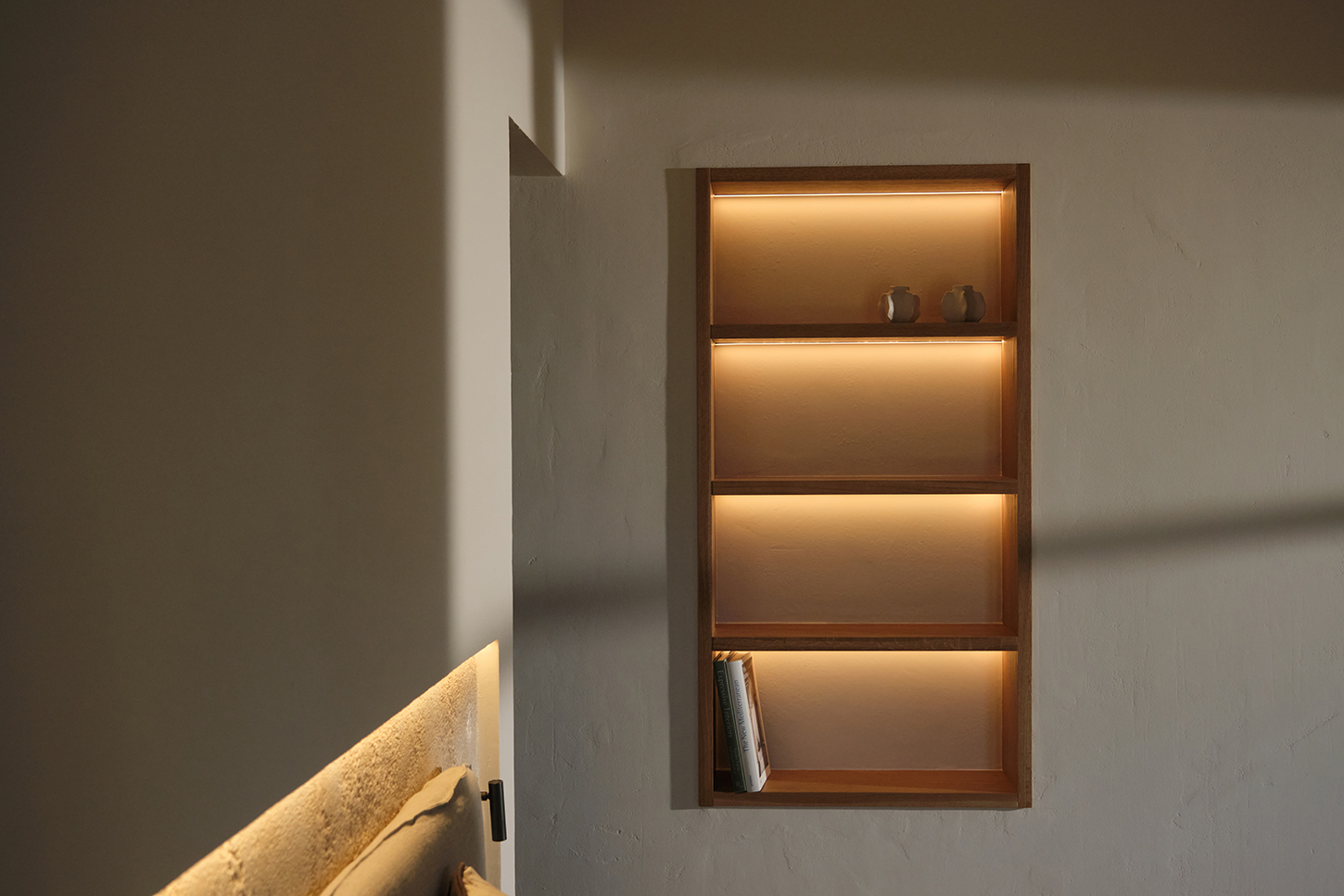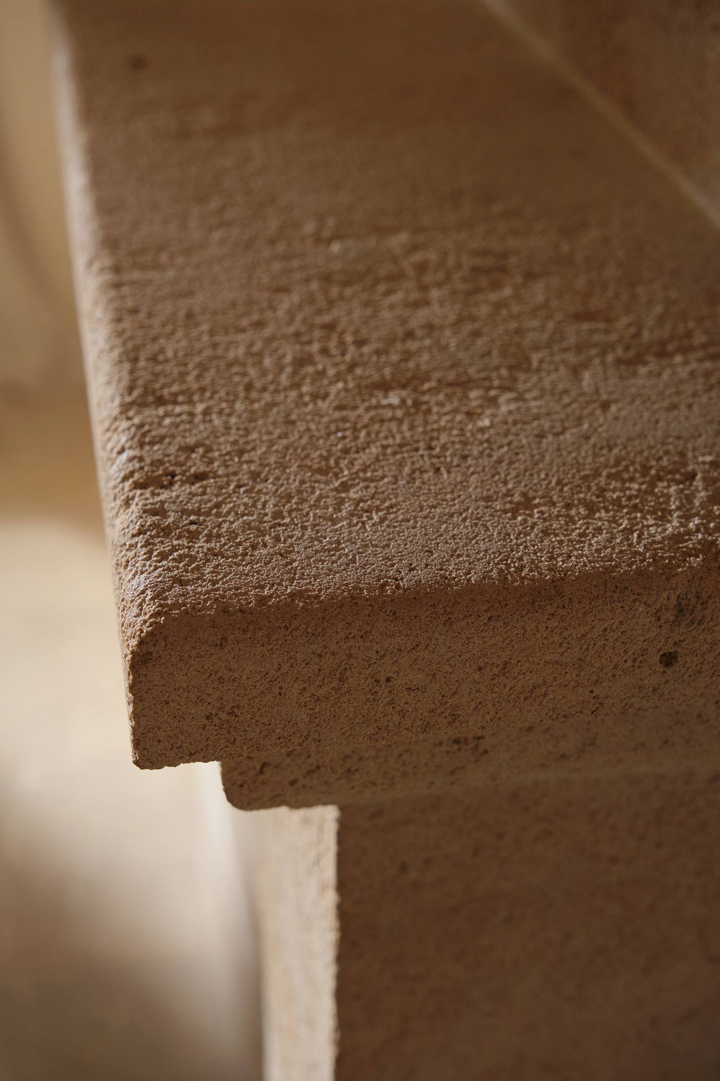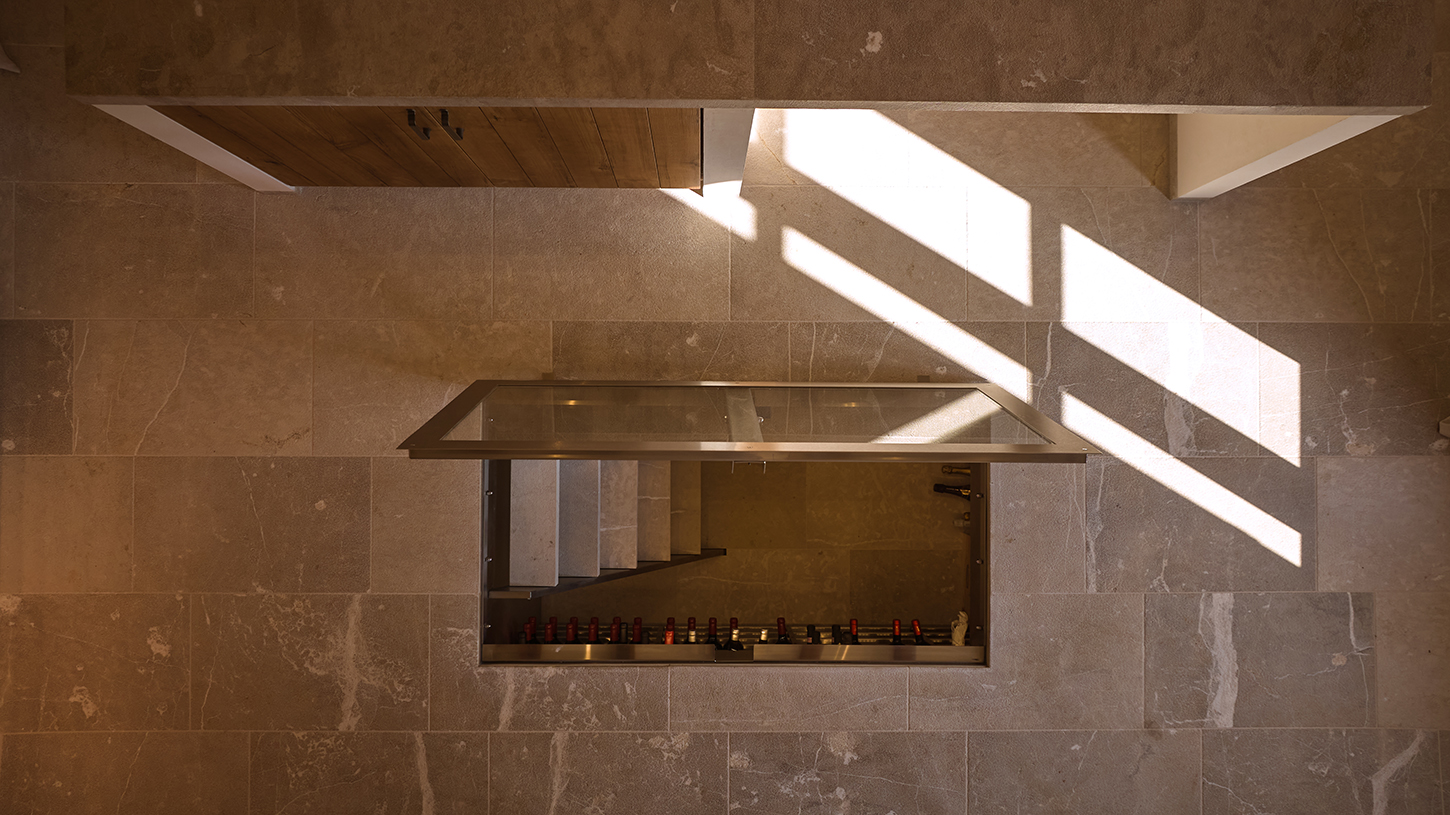 Its materials speak of memory and place: Mallorcan stone beneath the feet, iroko and brushed oak in the carpentry, resistant plasters that protect and beautify, and details in mares recalling the island’s heritage. The stone extracted from the site itself shapes the façade, binding the home deeply to the land that sustains it.