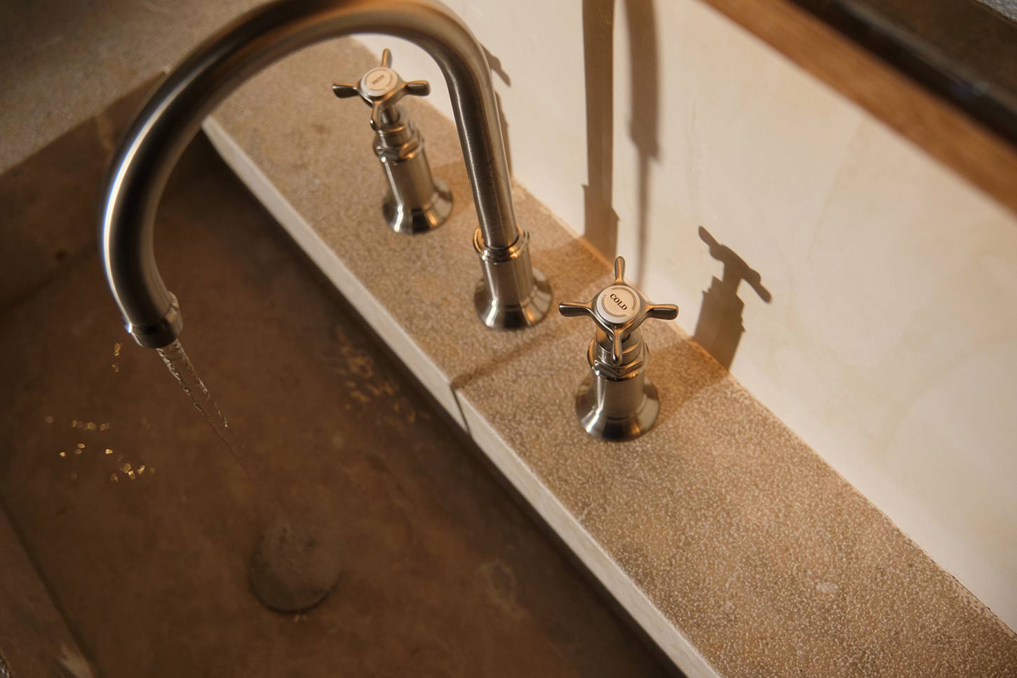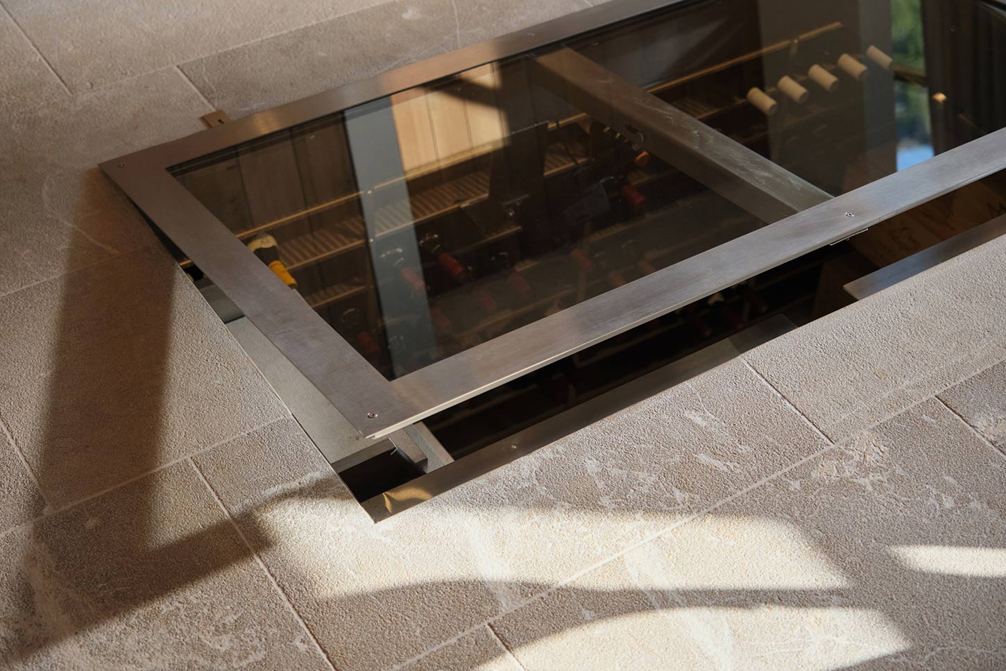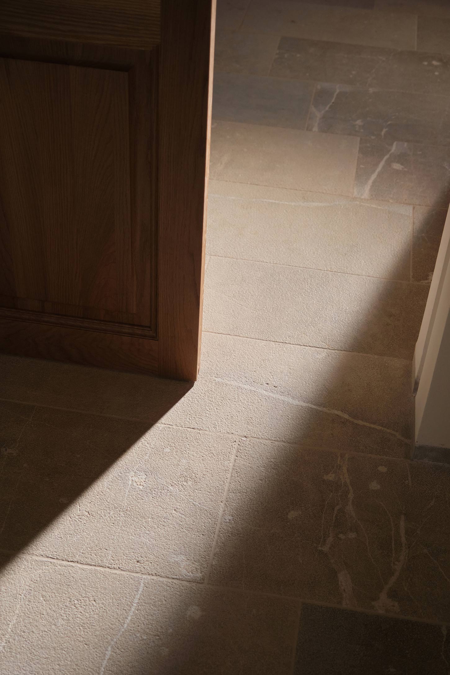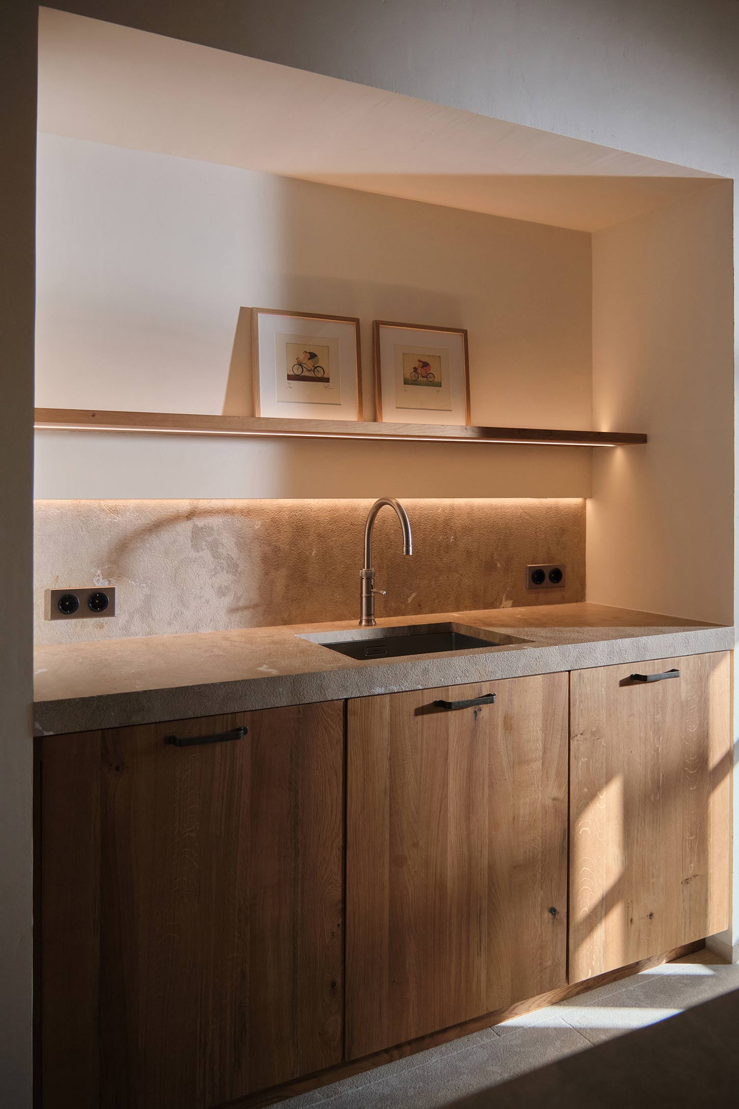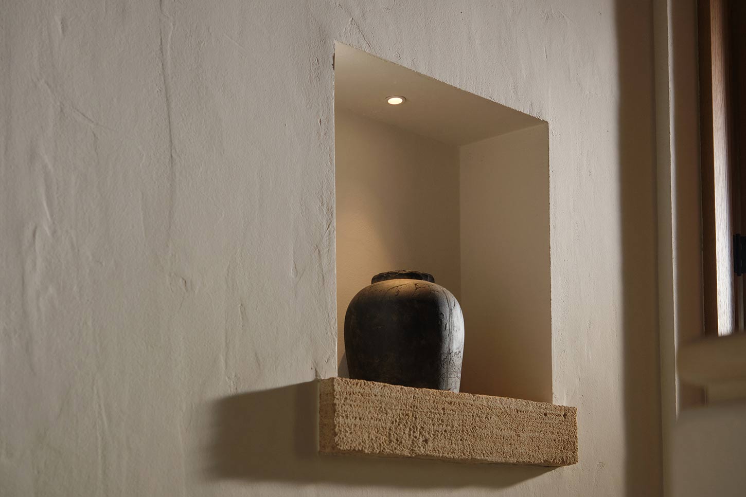 Its materials speak of memory and place: Mallorcan stone beneath the feet, iroko and brushed oak in the carpentry, resistant plasters that protect and beautify, and details in mares recalling the island’s heritage. The stone extracted from the site itself shapes the façade, binding the home deeply to the land that sustains it.