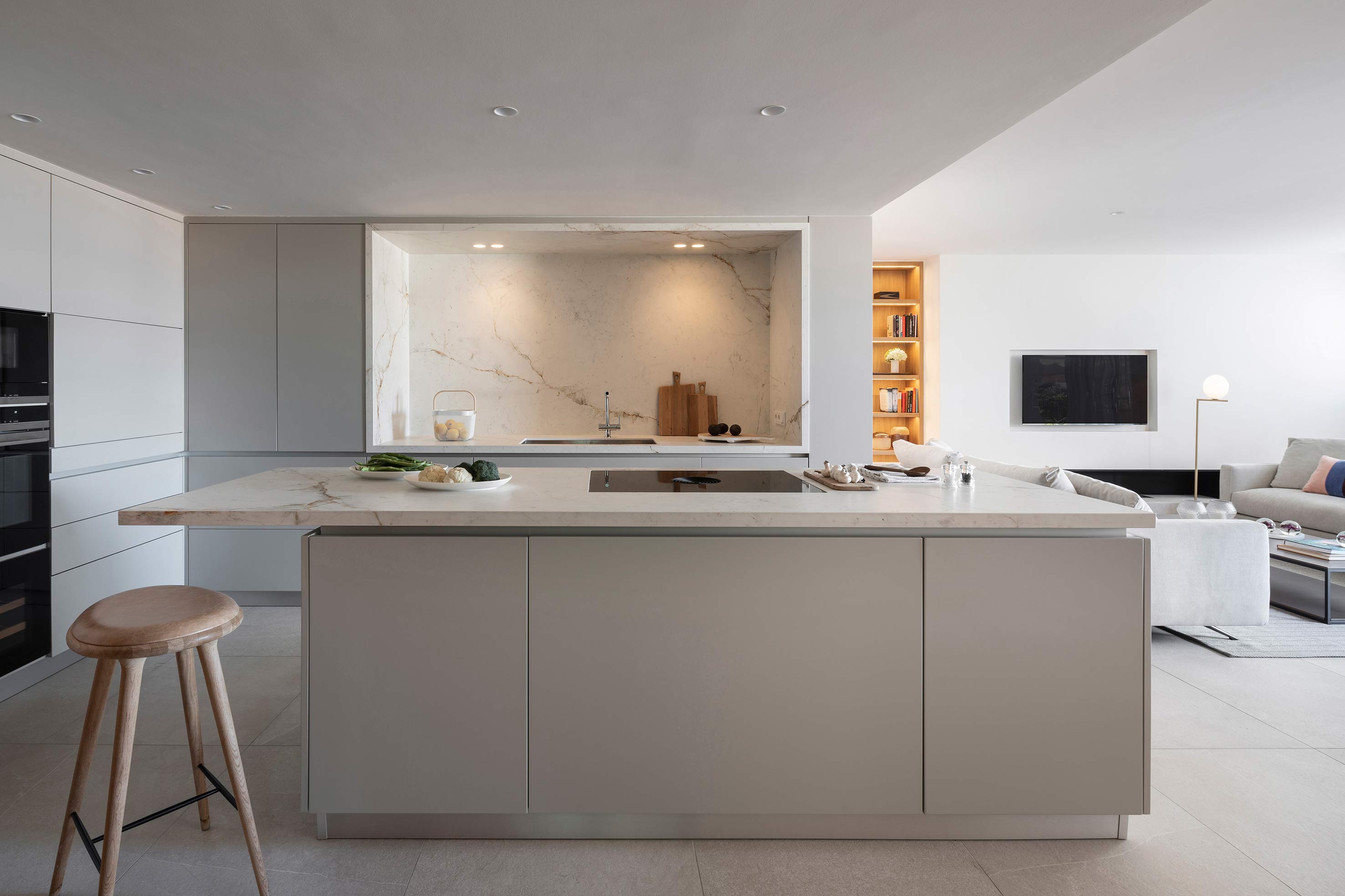 La paleta de materiales fue contenida: suelos de microcemento, carpintería metálica negra mate y acabados en roble cálido generan cohesión y serenidad. Todo el almacenamiento está integrado, las instalaciones ocultas y cada estancia se siente fluida, conectada y con propósito.